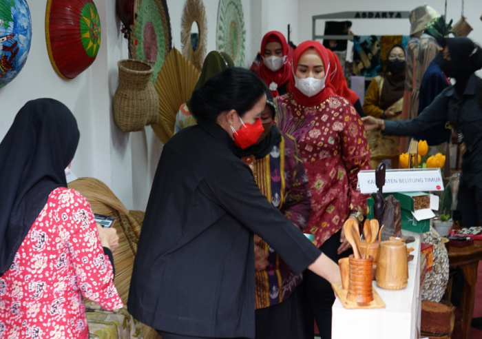 Saat pertama menginjakan kakinya di Destar Point, Rumah Bunda menjadi gerai pertama yang ia kunjungi. Tampak Puan Maharani melihat-lihat hingga memilih beragam aksesoris, batik, cual dan kerajinan lokal Bangka Belitung lainnya.