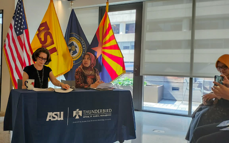 Bersama Susan Goldberg, ini menjadi kolaborasi dari sebuah kesempatan langka, Rektor UIN Raden Fatah Profesor menjadi tandem sebagai pembicara bersama berbicara tentang perubahan iklim di kampus Arizona State University (ASU).
