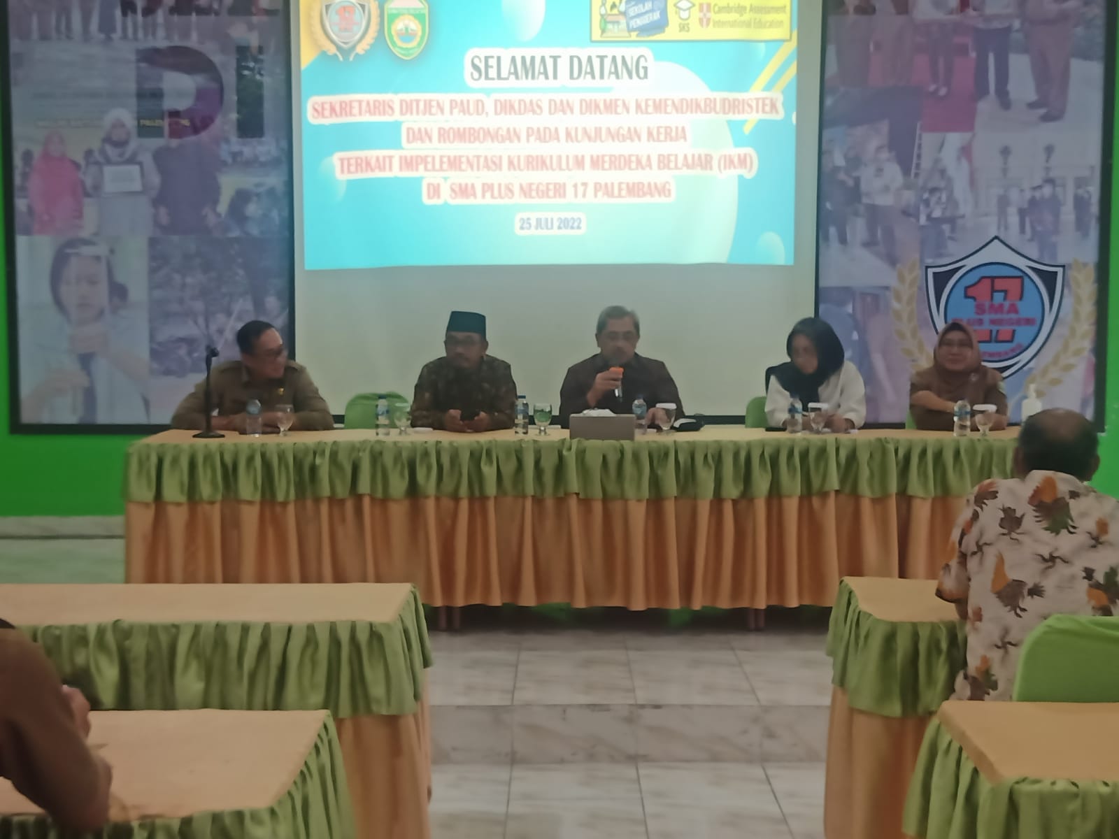 KATANDA.ID, Palembang – Sekretaris Dirjen Paud, Dikdas dan Dikmen Kemendibudristek melakukan kunjungan kerja terkait Implementasi Kurikulum Merdeka (IKM) di SMA Plus Negeri 17 Palembang, Senin (25/7/2022).