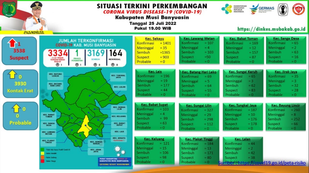 KATANDA.ID, Sekayu- Gugus Tugas Penanganan COVID-19 Muba, Senin (25/7/2022) mengkonfirmasi penambahan 1 kasus positif.