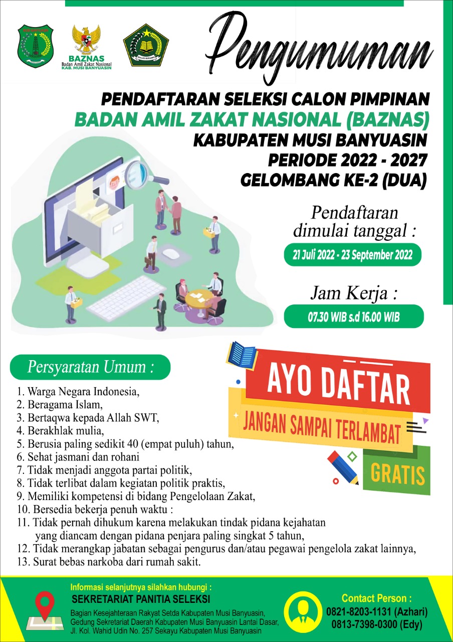 KATANDA.ID, Sekayu – Pemerintah Kabupaten Musi Banyuasin (Muba) melalui Bagian Kesra Setda Muba mengundang Tokoh Agama Islam, Ulama dan Tenaga Profesional terbaik di Muba, untuk mengikuti seleksi Calon Pimpinan Badan Amil Zakat Nasional (Baznas) Kabupaten Muba Periode 2022 – 2027 secara terbuka. Pendaftaran gelombang Kedua ini dilakukan pada 21 Juli – 23 September 2022.