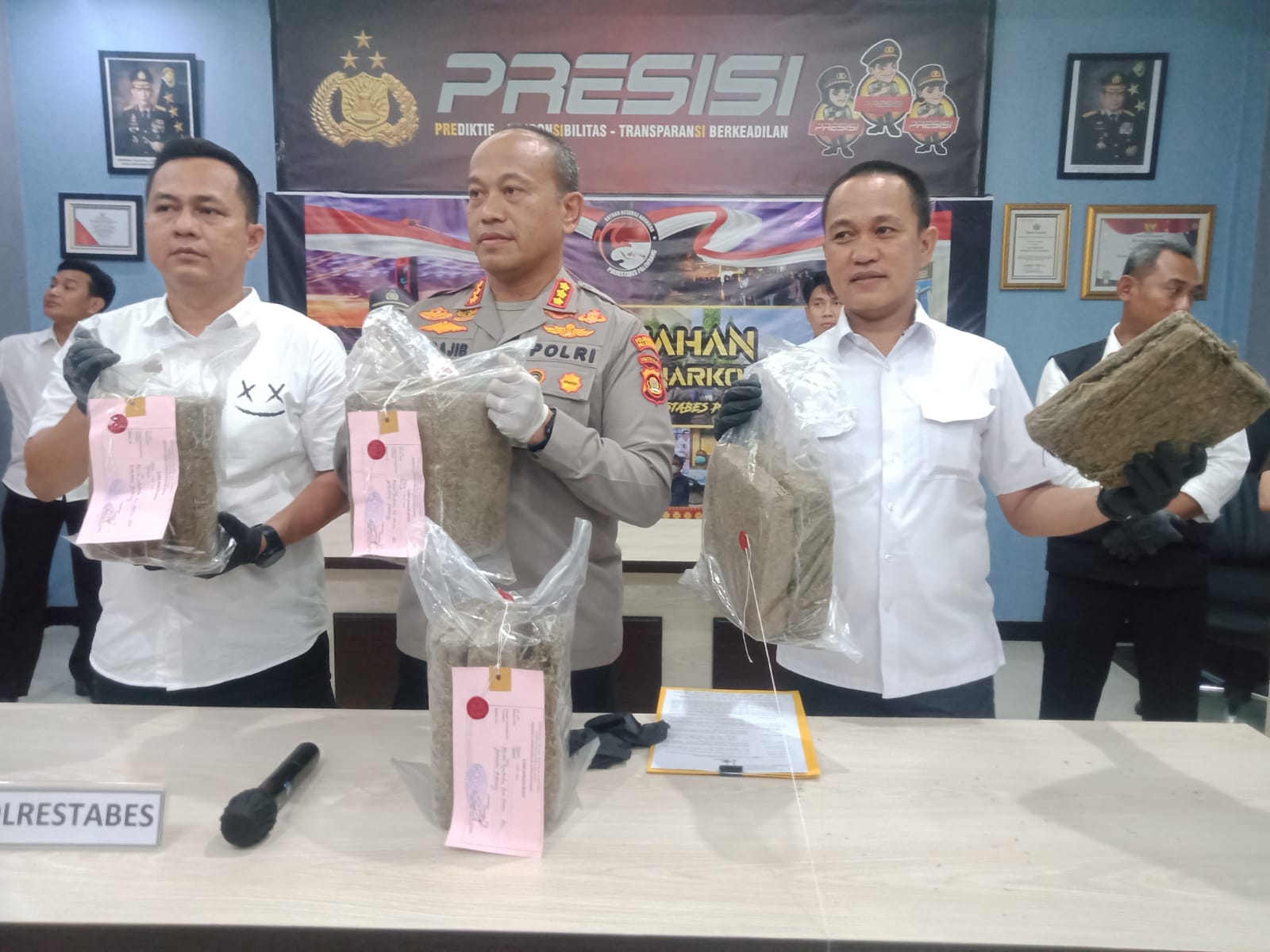 Kombes Pol Mokhamad Ngajib menuturkan saat dilakukan penggeladahan rumah kedua tersangka ditemukan ganja dalam bentuk persegi yang dipadatkan dan dibungkus dengan lakban coklat.