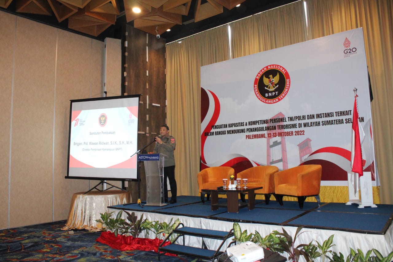 KATANDA.ID, Palembang – Komandan Lanud Sri Mulyono Herlambang Kolonel Pnb Sigit Gatot Prasetyo, M.M.O.A.S., hadiri Sosialisasi Penguatan Kapasitas dan Kompetensi Personel TNI-Polri yang dipimpin oleh Direktur Pembinaan Kemampuan BNPT Sumsel Brigjen Pol Wawan Ridwan, S.I.K., S.H., M.H., dalam rangka mendukung penanggulangan terorisme di wilayah Sumatera Selatan tahun 2022 bertempat di aula pertemuan hotel Aston Palembang, Rabu, (12/10).