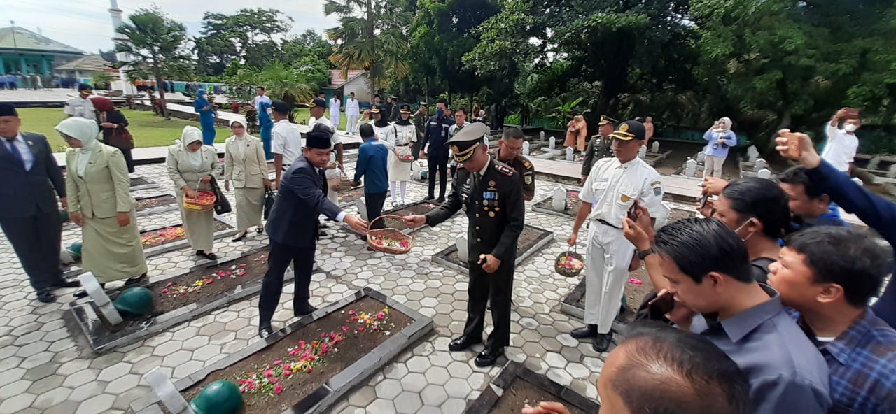 Selesai upacara dilanjutkan tabur bunga di pusaran makam para pejuang langsung dipimpin oleh Dandim 0404/ di ikuti peserta upacara. (Awang)