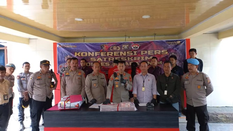 Kapolres Muara Enim AKBP Andi Supriadi didamping Kasat Reskrim AKP Tony dan Kasi Humas IPTU RTM Situmorang mengungkapkan penangkapan terhadap ketiga tersangka dilakukan setelah ditemukan kerugian negara atas audit BPK RI.