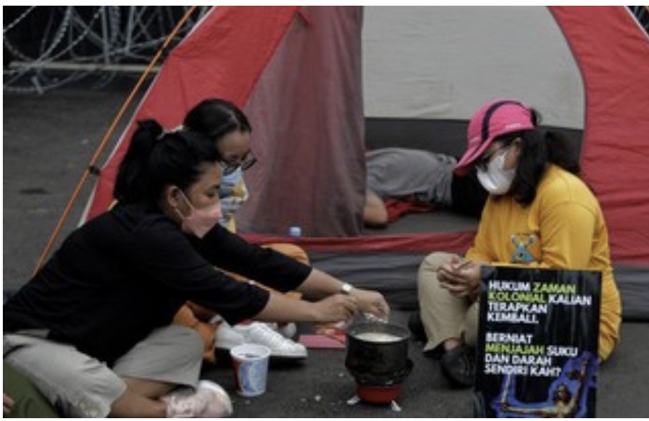 Sebagian demonstran mendirikan tenda di depan gerbang Kompleks Parlemen. Mereka dudu-duduk selayaknya orang berkemah sembari menyatakan penolakan.