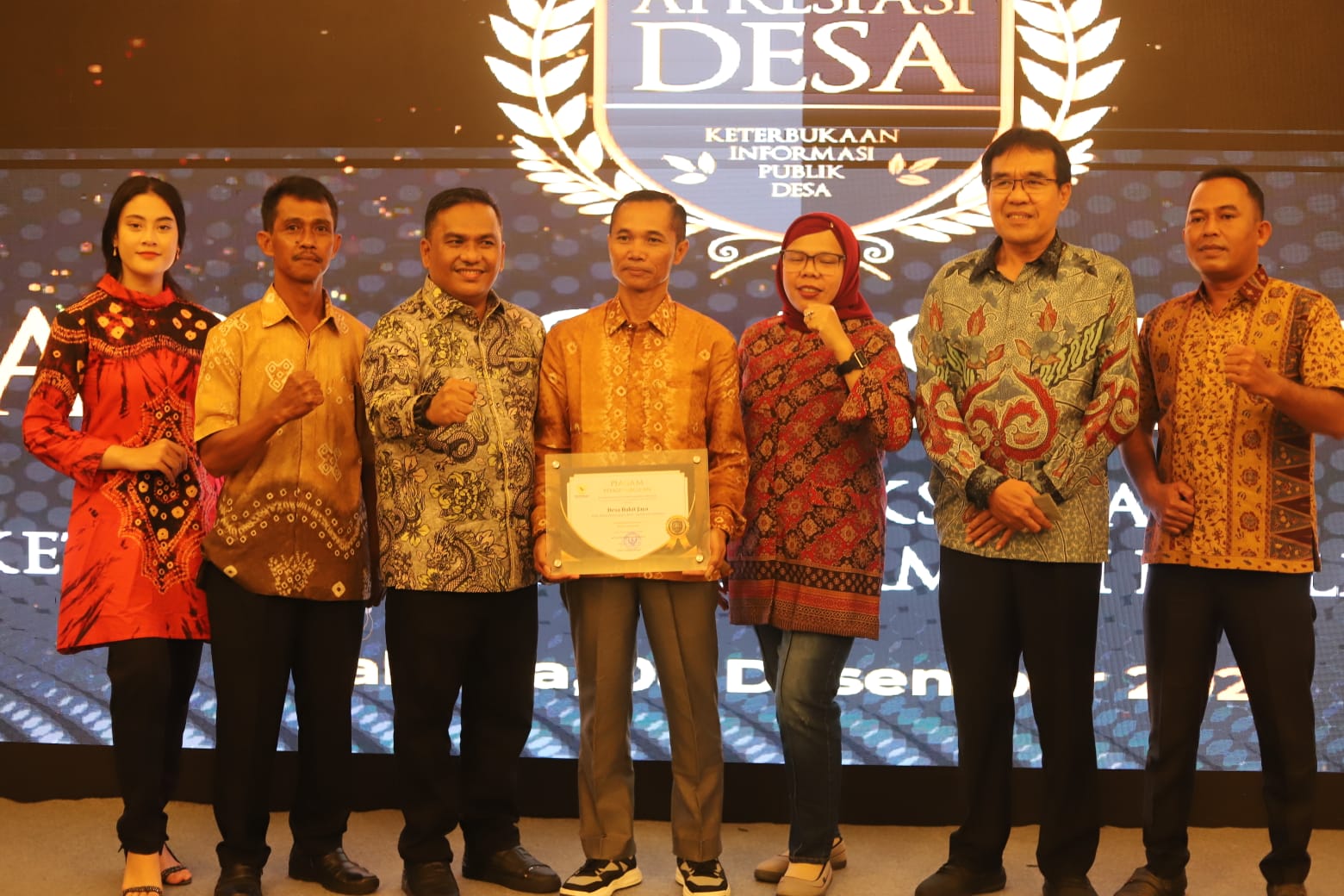 Kades Bukit Jaya, Juhari AMa Pd bersama Kepala Dinas PMD Sumsel Nelson Firdaus, Kepala Dinas Komunikasi dan Informatika Kabupaten Muba Herryandi Sinulingga AP serta Komisioner KI Provinsi Sumsel Hibza Meiridha Badar, menerima langsung piagam penghargaan tersebut di Hotel Grand Sahid Jaya Jakarta, Kamis (8/12/2022).