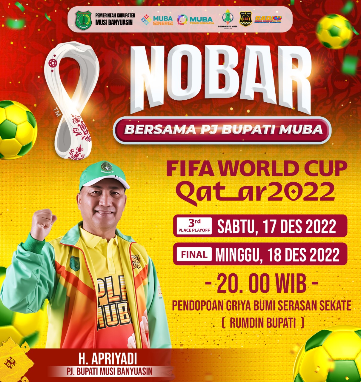 Penjabat Bupati Kabupaten Musi Banyuasin (Muba) Apriyadi pun berinisiatif untuk menggelar nobar di kediaman atau rumah Dinas Bupati Muba di Sekayu untuk dua partai final tersebut. Maka pengumuman pun disebar melalui media massa dan media sosial (medsos) yang isinya bertajuk “Nobar Bersama PJ Bupati Muba FIFA World Cup Qatar 2022.” Jadwal nonton bareng tersebut pada Sabtu (17 Desember 2022) dan Ahad (18 Desember 2022) sejak pukul 20.00 WIB.