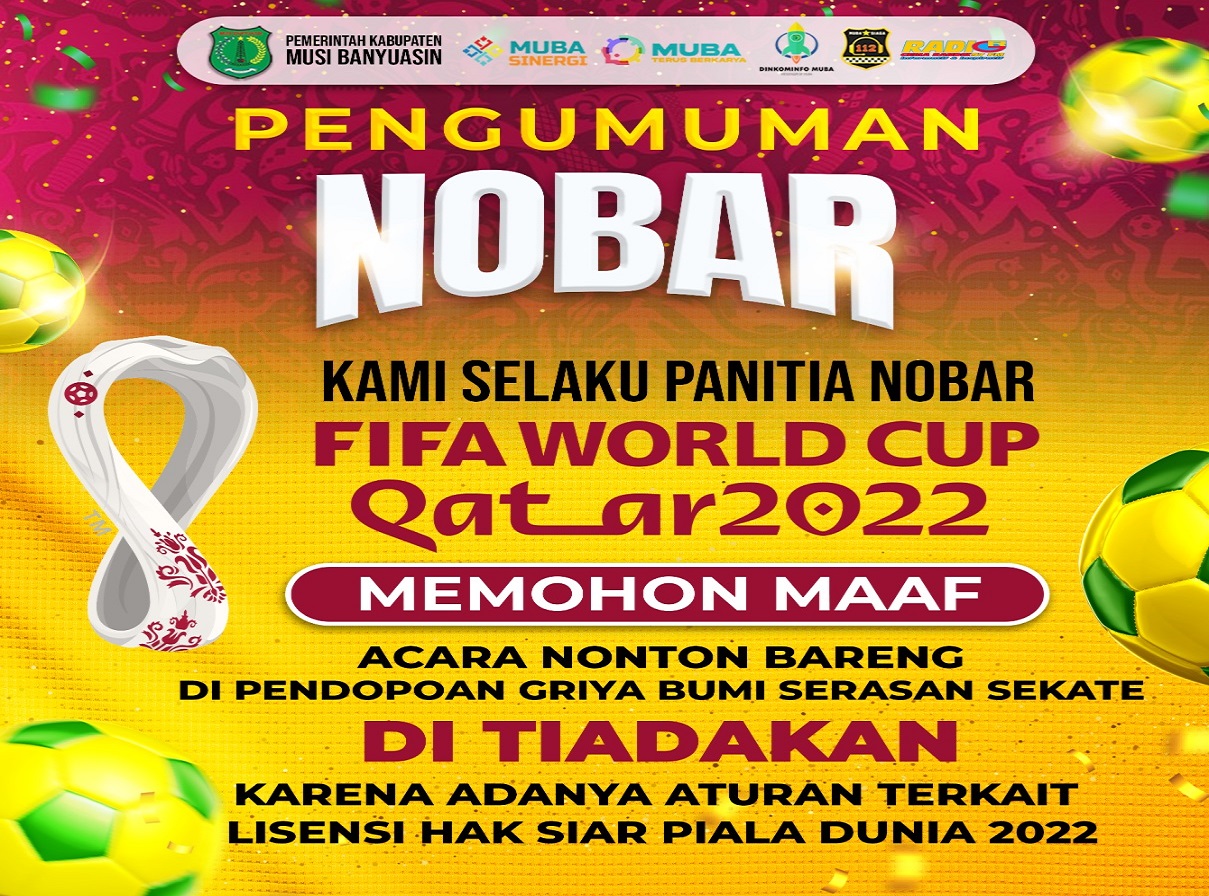 Kepala Dinas Komunikasi dan Informatika (Kominfo) Muba Herryandi Sinulingga mengatakan, “Acara nonbar ditiadakan karena terkait lisensi hak siar Piala Dunia 2022. Kami mengimbau agar masyarakat dapat memperhatikan regulasi penyiaran Piala Dunia 2022. Sebab, jika terbukti melanggar regulasi dan menyelenggarakan nobar tanpa izin dari pemilik lisensi hak siar akan terancam pidana penjara dan denda hingga maksimal Rp1 miliar.”
