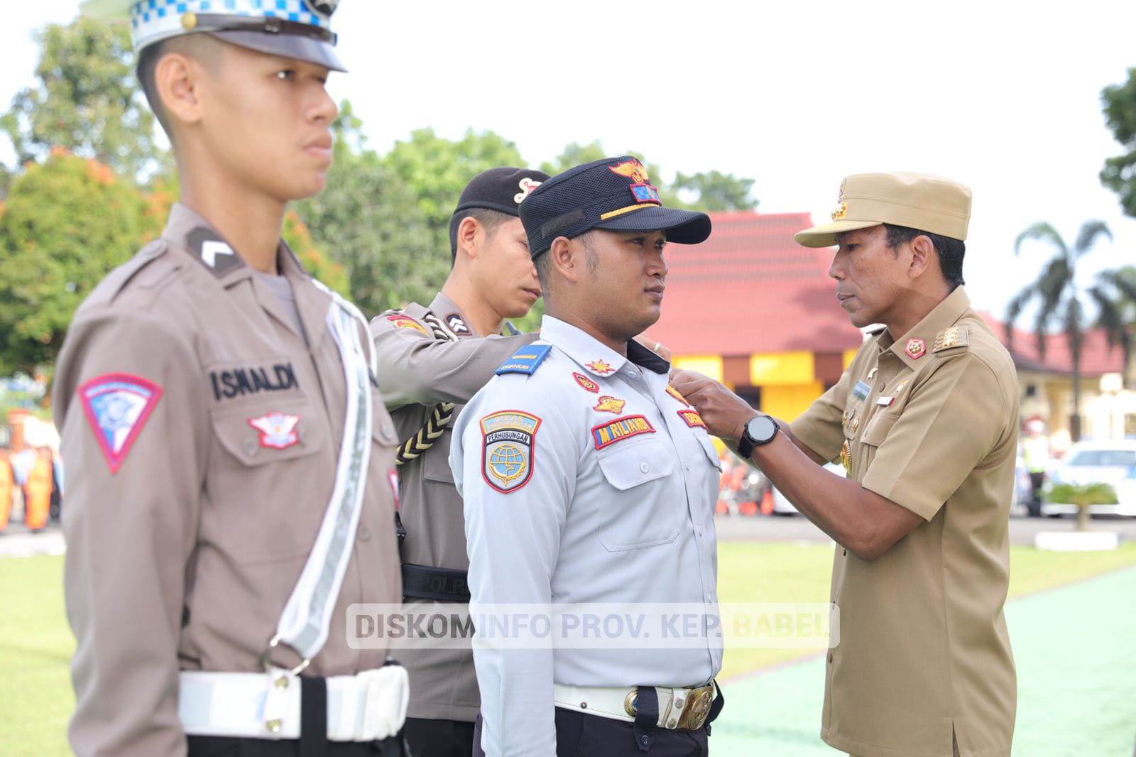 Pj Gubernur Suganda juga berkesempatan menyematkan tanda personel kepada perwakilan pasukan dalam Apel Gelar Pasukan di Provinsi Kepulauan Bangka Belitung.