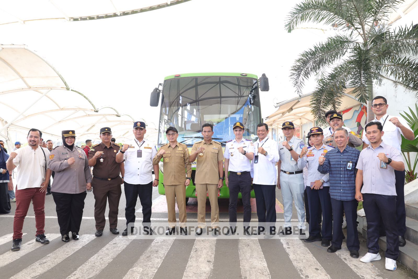 KATANDA.ID, Pangkalpinang – Bersama Bupati Bangka Tengah Algafry, didampingi Kepala Dinas Perhubungan (Kadishub) Bangka Tengah Fani, Kepala Balai Denny, serta GM Angkasa Pura, Pj Gubernur Kepulauan Bangka Belitung (Babel) Suganda Pandapotan Pasaribu, berkesempatan mengibarkan bendera melepas Bus Angkutan Mudik Gratis Kabupaten Bangka Tengah, Senin (17/4/2023).