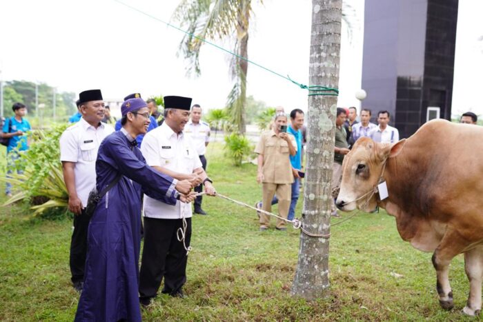 KATANDA.ID, Sekayu – Puluhan hewan kurban berupa Sapi dan Kambing hasil urunan pejabat di lingkungan Pemkab Muba disalurkan langsung Pj Bupati Apriyadi Mahmud, Selasa (27/6/2023) di Masjid Raya Baitul Makmur, Sekayu.