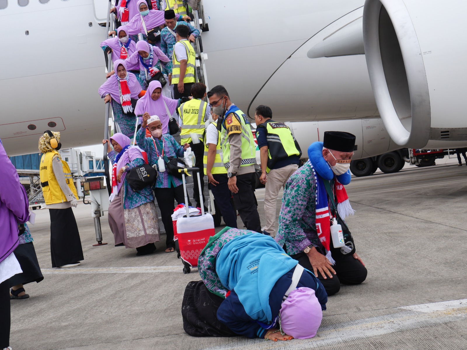 KATANDA.ID, Palembang – Sebanyak 359 jemaah haji Kloter 4 Debarkasi Palembang tiba di Bandara SMB II Palembang, Selasa (11/7), pukul 10.16 WIB. Satu orang jamaah atas nama Sutanto Jasmangun (71) langsung dirujuk ke Rumah Sakit Siti Fatimah Palembang.