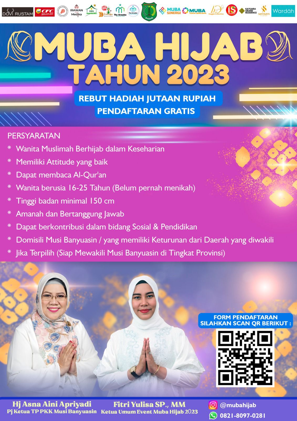Kegiatan Muba Hijab 2023 gratis pendaftaran dan mendapat dukungan penuh dari ketua Tim Penggerak PKK Muba Hj Asna Aini Apriyadi yang juga sebagai penasehat Muba Hijab dan juga didukung oleh beberapa sponsor yang ikut berpartisipasi dalam gelaran acara tersebut.