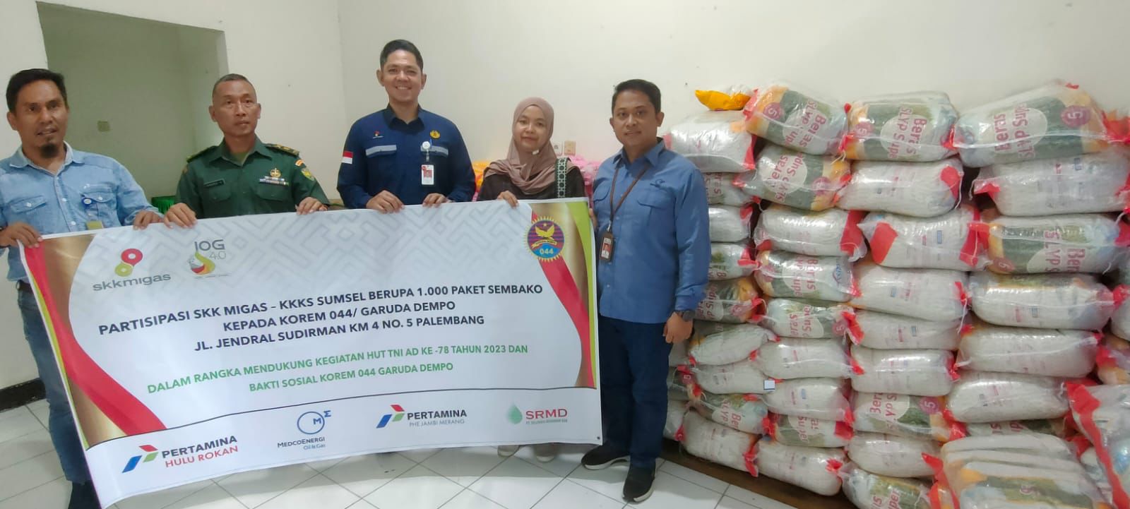 KATANDA.ID, Palembang – Satuan Kerja Khusus Pelaksana Kegiatan Usaha Hulu Minyak dan Gas Bumi (SKK Migas) bersama Kontraktor Kontrak Kerja Sama (KKKS) PHR Regional 1 Zona 4, PHE Jambi Merang, Medco E&P Indonesia dan Seleraya Merangin Dua melakukan serah terima bantuan berupa 1.000 paket sembako kepada Korem 044/Garuda Dempo dalam rangka memperingati HUT TNI Ke-78 Tahun 2023. Partisipasi bantuan diserahkan langsung oleh SKK Migas – KKKS kepada Korem 044/Garuda Dempo berlokasi di Jl. Jendral Sudirman, KM 4, No. 5, Palembang – Sumatera Selatan.
