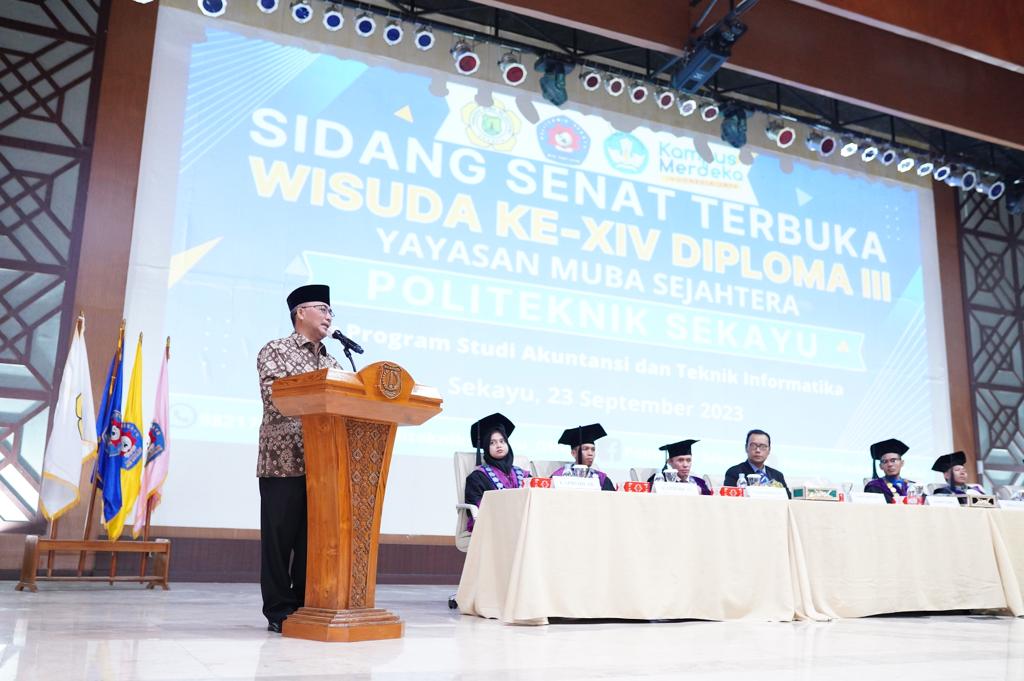 Wisuda ke-14 Politeknik Sekayu ini dihadiri secara oleh Penjabat Bupati Musi Banyuasin Drs H Apriyadi Mahmud, Sabtu (23/9/2023) di Opproom Pemkab Muba.