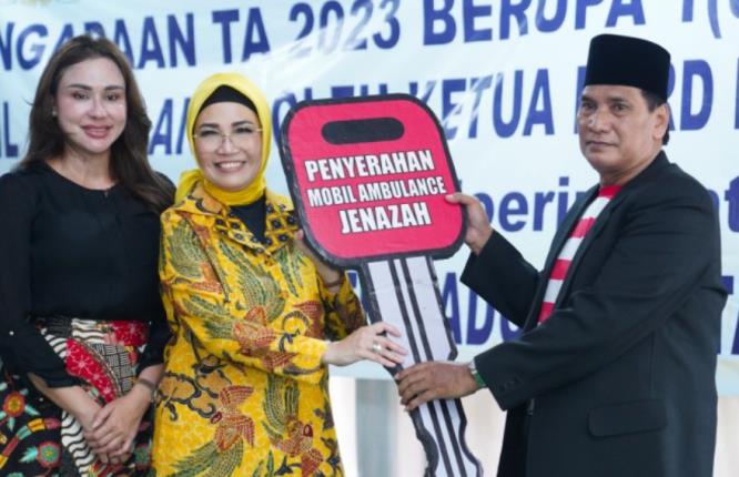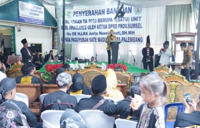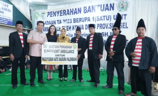 Ketua DPRD Provinsi Sumatera Selatan (Sumsel), Dr. Hj R.A. Anita Noeringhati, SH MH., didampingi anggota DPRD Sumsel, Nadia Basyir SE., menyerahkan bantuan mobil ambulance kepada Paguyuban Sate Madura Kota Palembang. Acara berlangsung di Sekretariat PSMP, Jl Alamsyah Ratu Prawiranegara, Palembang pada Sabtu, (2/12/2023).