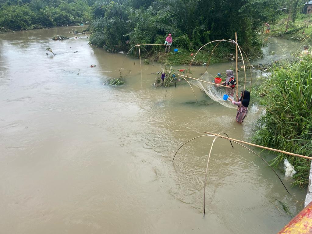 Warga berbondong-bondong menggunakan tangkul menuju sungai untuk mencari ikan ditengah luapan sungai.