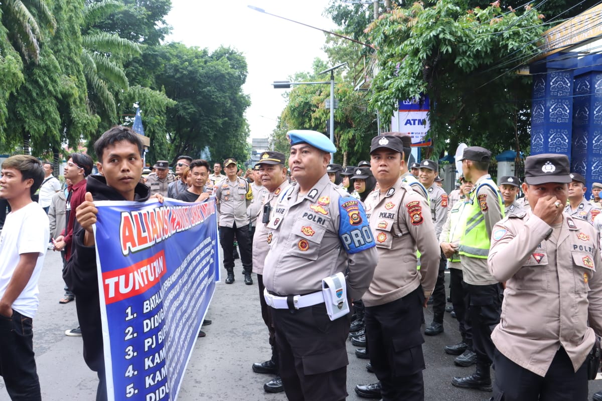 Kapolres Lahat, AKBP God Parlasro S.Sinaga SH.SIK.MH, didampingi oleh Kabag Ops Kompol Aan Sumardi SE.MM, Kasat Intel Mulyono SH, Kasat Samapta AKP Hipni SH, Kasat Lantas AKP Muruyanto SH.MH, dan Kapolsek Kota AKP Samsuardi, memimpin pengamanan dan pengawalan aksi unjuk rasa yang diselenggarakan oleh Aliansi Rakyat Lahat Menggugat.