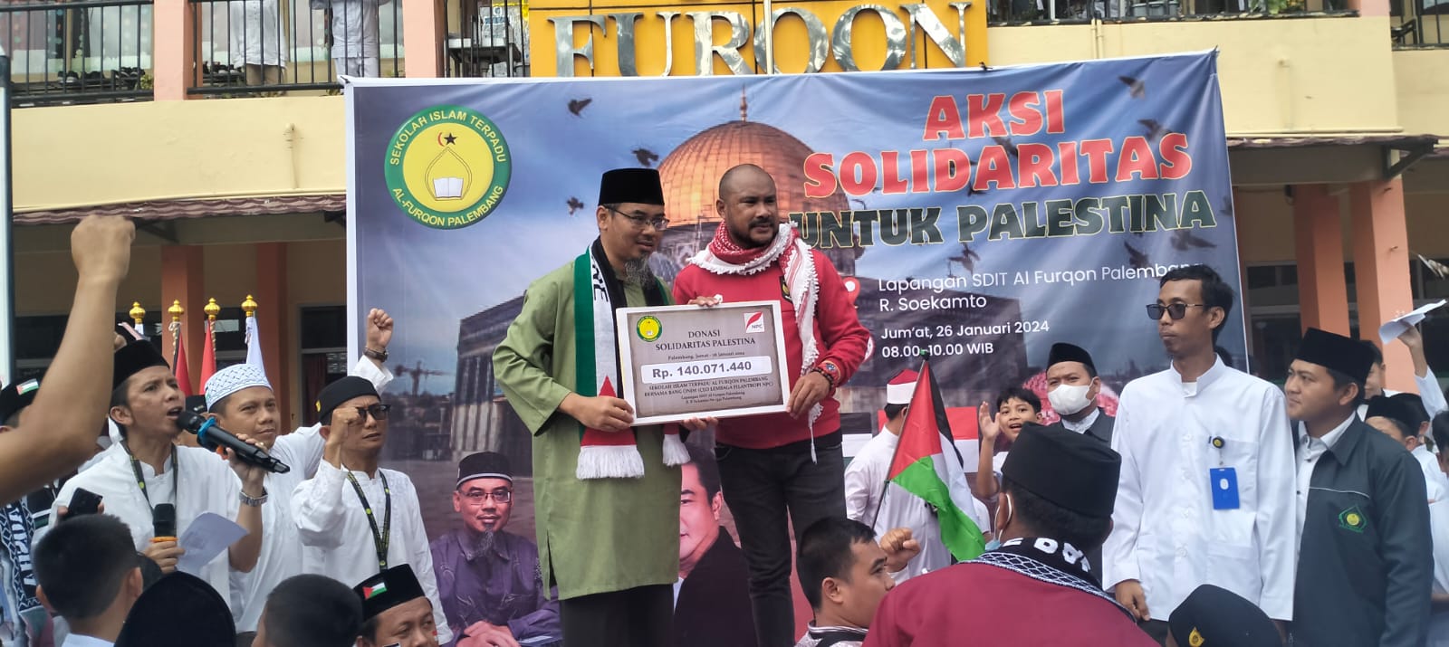 KATANDA.ID, Palembang – Aksi Solidaritas Untuk Palestina dari SIT Al Furqon Palembang disampaikan kepada Aktivis Kemanusiaan Abdillah Onim yang akrab disapa Bang Onim sebesar Rp 140. 071.440 bertempat lapangan Sekolah Islam Terpadu (SIT) Al Furqon Palembang, Jumat 26 Januari 2024.