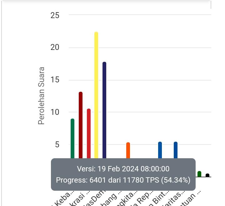 Dimana hasil perhitungan suara sementara yang tercatat di website resmi KPU, Partai Golkar mendominasi suara dengan perolehan 175.502 suara atau 22.52 persen.