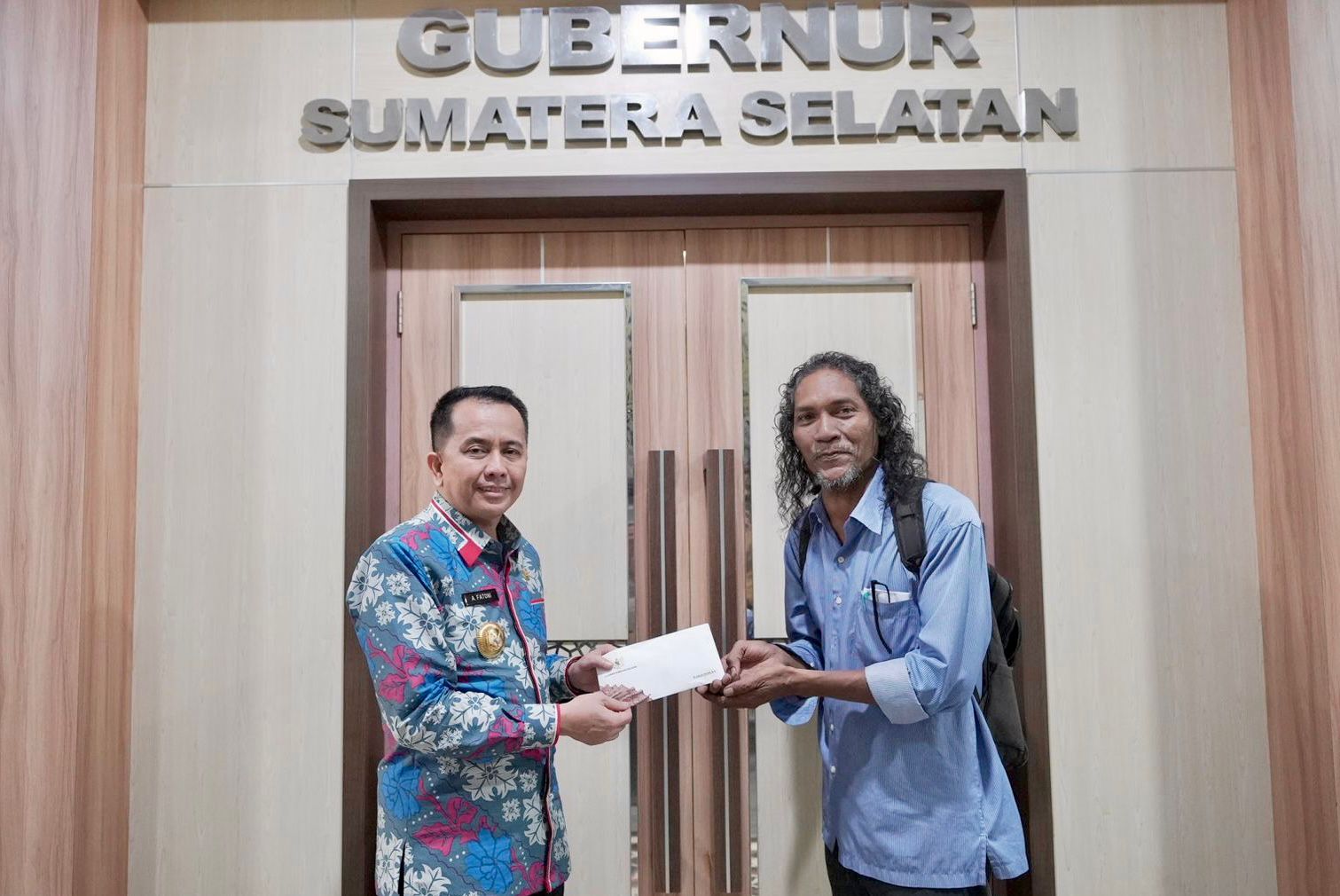 KATANDA.ID, Palembang – Penjabat (Pj) Gubernur Sumatera Selatan Agus Fatoni memberikan bantuan modal usaha melukis pada P Yudha Marbun (50) salah satu penyandang tuna rungu. Fatoni menyambut kedatangan Yudha Marbun dengan suka cita di Kantor Gubernur Sumsel, Palembang, Senin (26/2/2024).