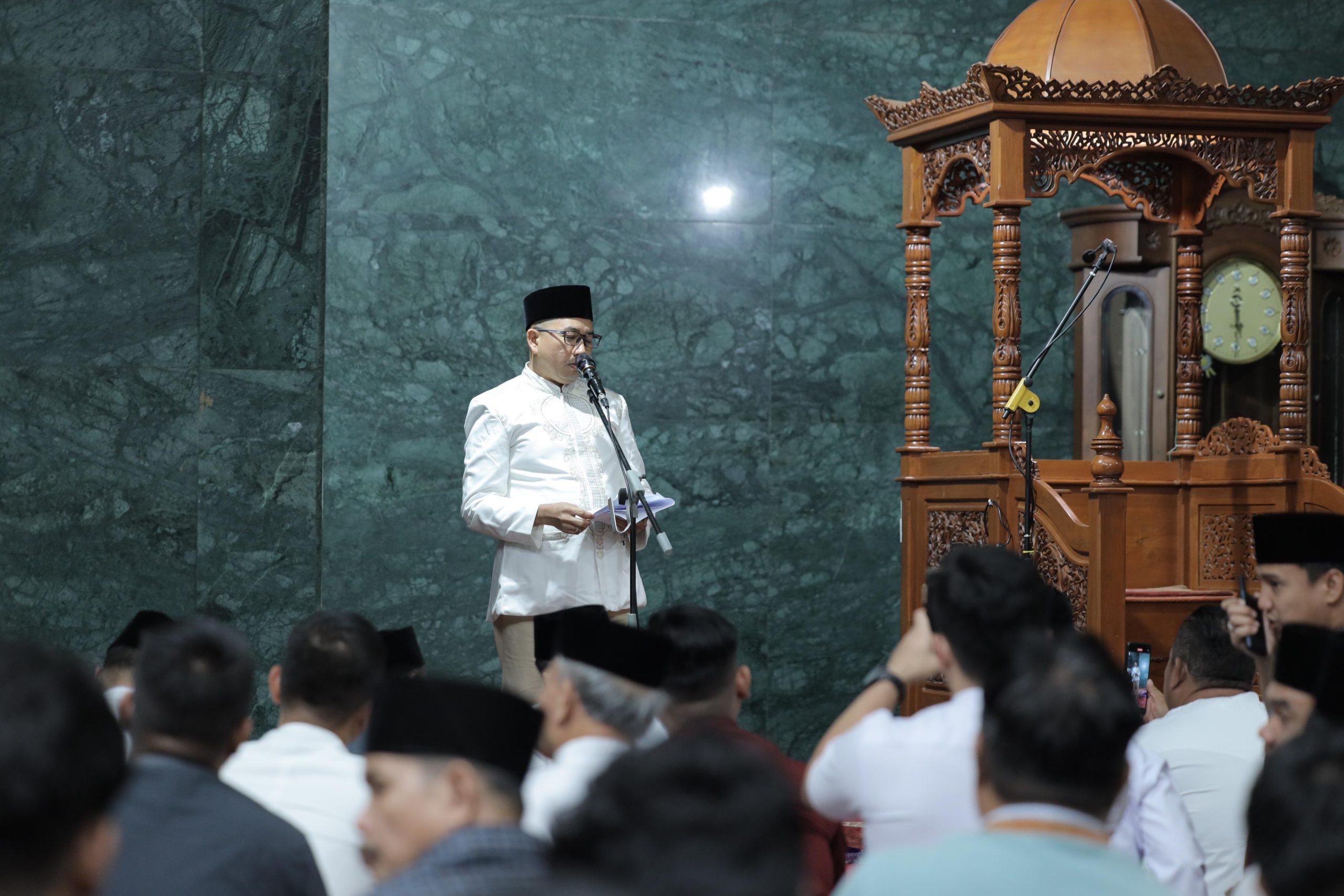 KATANDA.ID, Palembang – Penjabat (Pj) Gubernur Sumatera Selatan (Sumsel) Agus Fatoni bersama Pj Ketua Tim Penggerak (TP) Pemberdayaan Kesejahteraan Keluarga (PKK) Tyas Fatoni bersama Forum Koordinasi Pimpinan Daerah (Forkopimda) dan Kepala BUMN/BUMD melaksanakan salat isya dan tarawih berjamaah. Kegiatan ini dilaksanakan di Masjid Ar-Ra’iyah DPRD Provinsi Sumsel, Palembang, Sumatera Selatan, Rabu (13/3/2024).