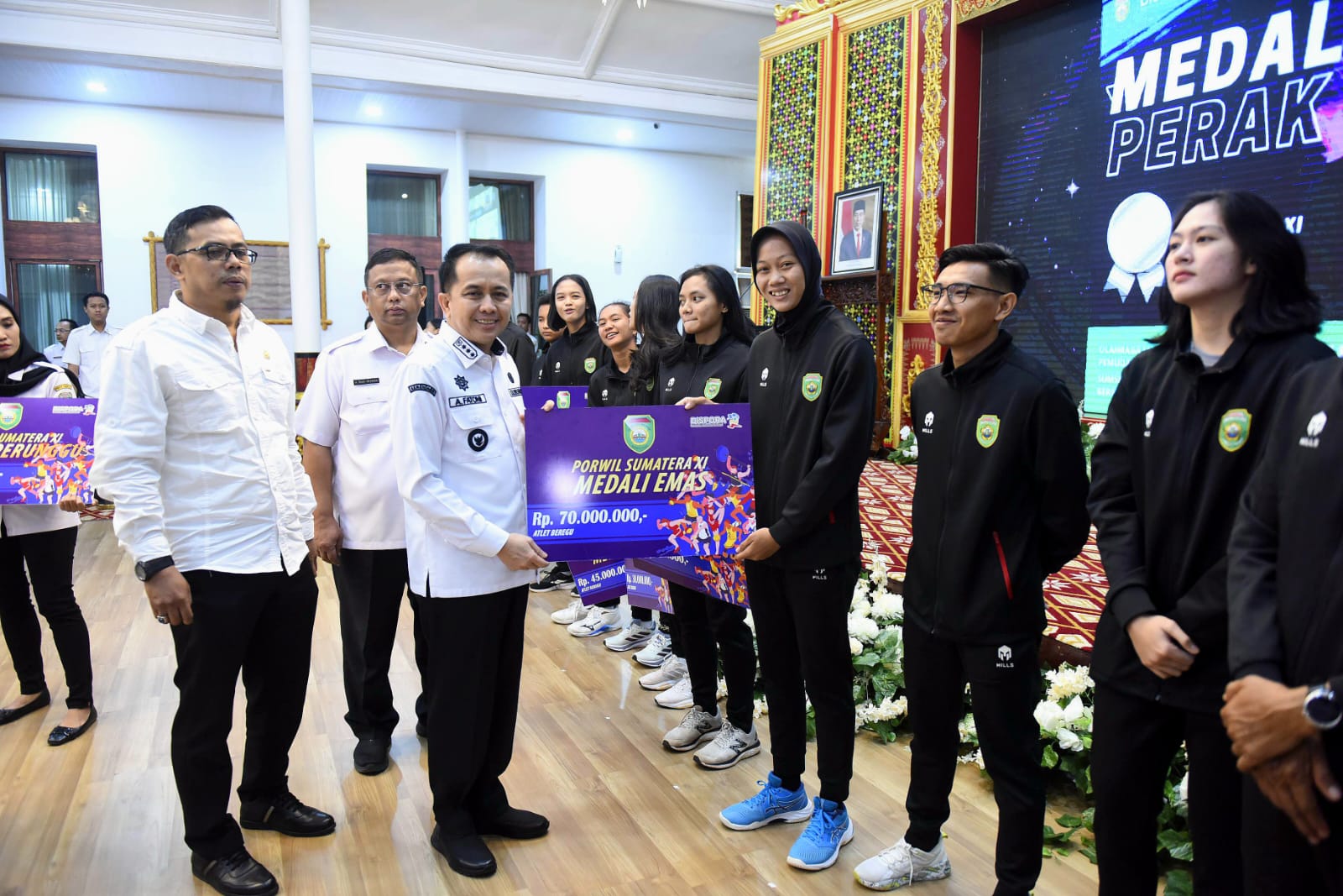 “Selamat untuk para atlet adik-adik sekalian dan para pelatih yang telah berjuang dan mengukir prestasi pada Porwil di Riau kemarin sehingga dapat mengharumkan nama Sumsel. Tentu kami dari Pemprov memberikan bonus ini sebagai bentuk penghargaan serta apresiasi dan tentu kami bangga, haru dan senanh akan hal ini,” kata Fatoni.