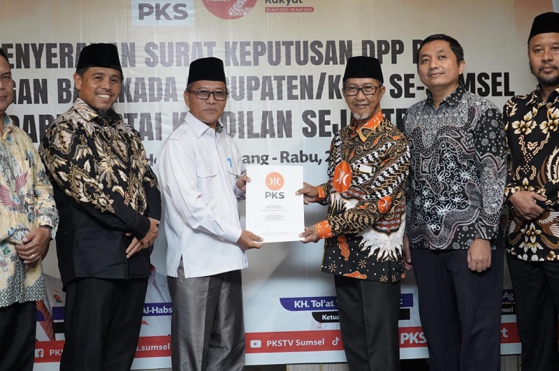 Penyerahan SK Nomor : 629.8.5.A/SKEP/DPP-PKS/2024 tersebut dilakukan di Hotel Excelton Palembang, Rabu (26/6/2024) siang yang diserahkan langsung Ketua MPW PKS Sumsel KH Tol’at Wafa Ahmad Lc didampingi Sekretaris DPW PKS Sumsel, Irwan Irawadi dan Ketua DPD PKS Muba Musheni yang diterima oleh Ketua Tim Pemenangan Bakal Cabup Muba Apriyadi yakni Chandra SKM MSi.