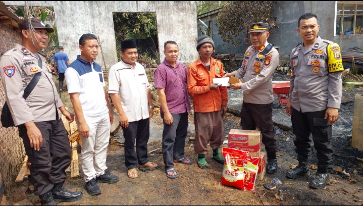 Kapolsek Keluang Akp. Hendra Sutisna, SH, didampingi ketua KPAD Muba Soleman, Mpd,i, Kanit Intelkam, Ipda Dian Saputra, S. Psi, Kanit Binmas Aipda Harinata Utama, SH, Kanit Propam Aiptu Hadi Kurniawan, beserta Bhabinkamtibmas Aipda Fansa Sahlan, menyambangi korban musibah kebakaran rumah di kelurahan Keluang, Kecamatan Keluang.