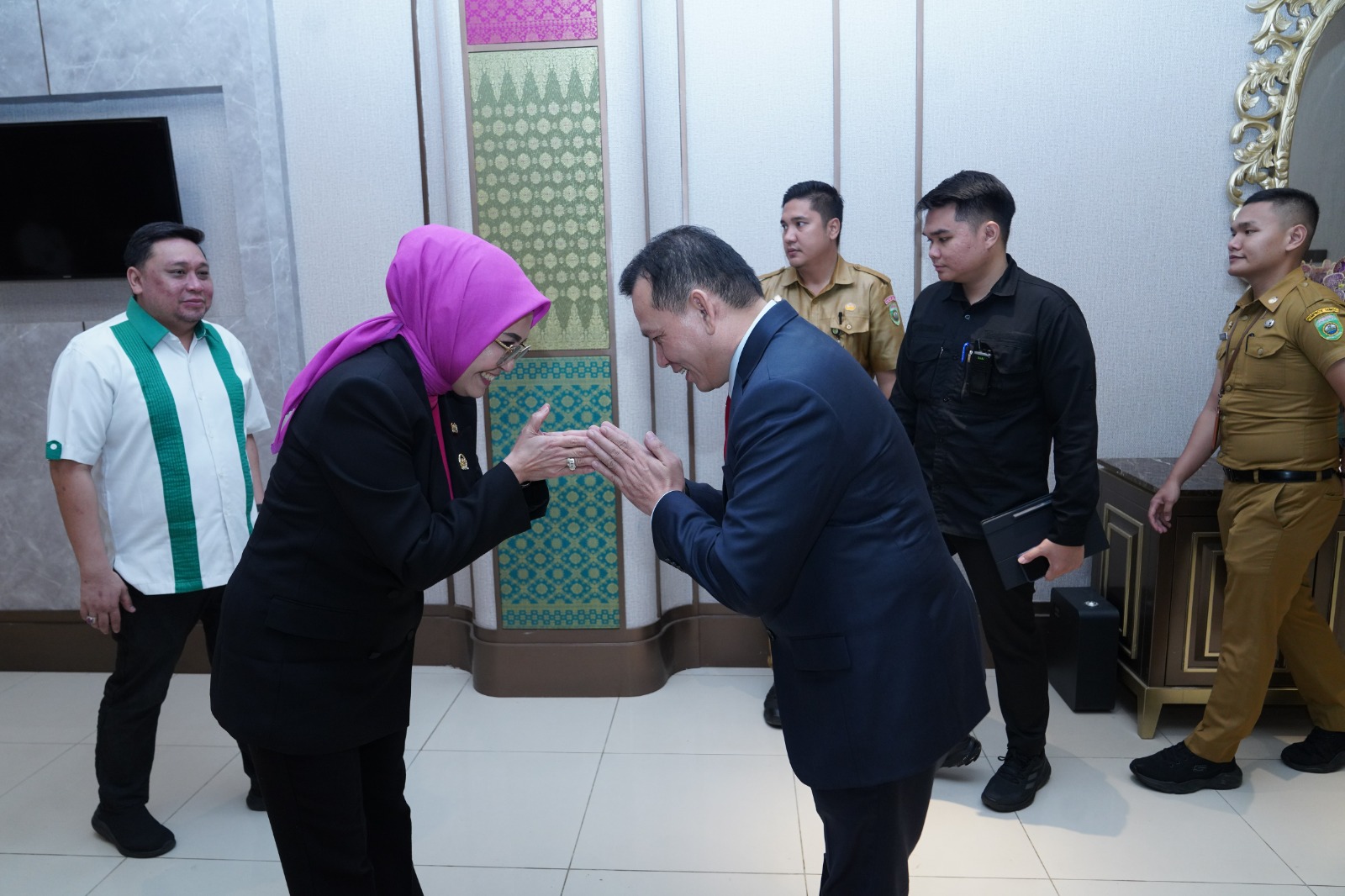 Sementara ketua DPRD Provinsi Sumsel Dr Hj RA Anita NoeringHati SH MH menyambut kedatangan PJ Gubernur Sumatera Selatan Elen Setiadi SH yang baru saja di Lantik menggantikan PJ Gubernur yang lama Agus Fatoni.