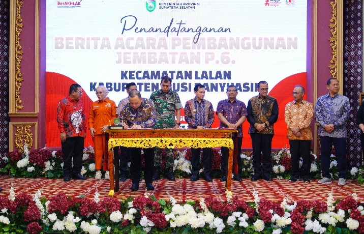 Perbaikan Jembatan (P6) Sungai Lalan Kecamatan Lalan Kabupaten Musi Banyuasin di Ruang Rapat Griya Agung Palembang, Jumat (30/8/2024) yang dihadiri langsung, Pj Gubernur Sumatera Selatan Elen Setiadi, Pj Bupati Muba H Sandi Fahlepi Wakil Ketua DPRD Muba Jhon Kenedi dan Sekda Muba H Apriyadi , kepala Dinas Perhubungan Musni Wijaya,Kepala Dinas PU PR Alva Elan, Kabag Hukum Roma Sari Purba, Camat Lalan Jamian.
