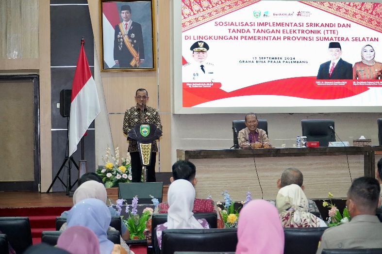 KATANDA.ID, Palembang – Sekretaris Daerah (Sekda) Provinsi Sumatera Selatan (Sumsel) Drs H Edward Candra MH, secara resmi membuka Sosialisasi Implementasi aplikasi Srikandi dan Tanda Tangan Elektrik (TTE) di Lingkungan Pemerintah Provinsi Sumsel, bertempat di Auditorium Bina Praja Pemprov Sumsel, Kamis (12/9/2024).