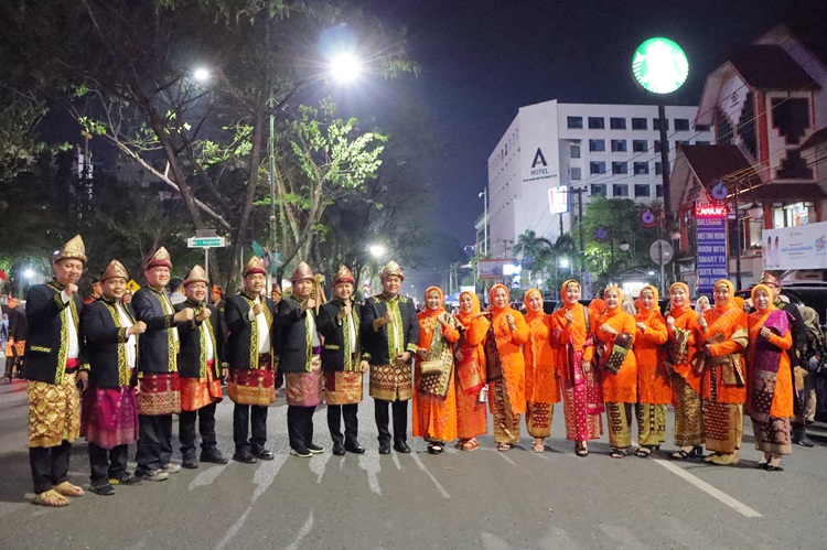 Kontingen karnaval Palembang tampak anggun dan gagah dengan memakai pakaian adat. Di barisan depan kontingen tampak Sekda Aprizal Hasyim, Kadin Kebudayaan Affan Prapanca, diapit Bujang Gadis dan Cek Agus Cek Ayu Palembang.