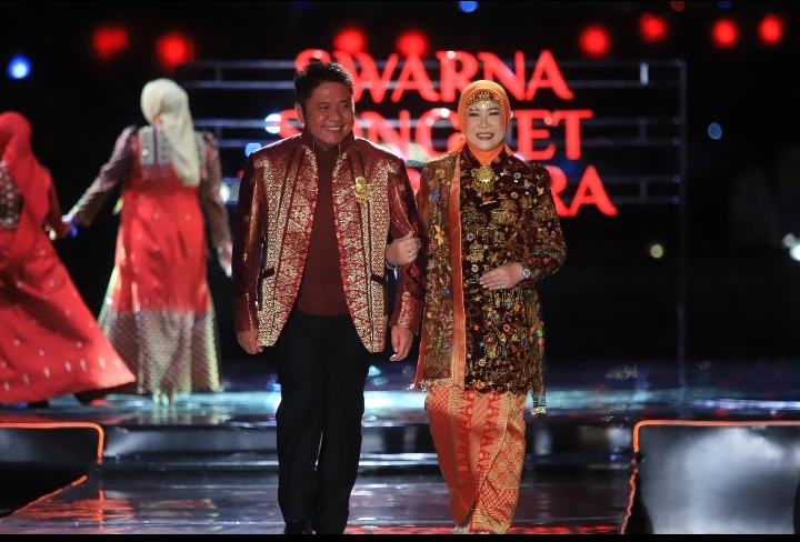 Ia tampil bersama sang istri, Ketua Dekranasda Sumsel Hj. Feby Deru, yang tak kalah anggun mengenakan busana bermotif lepus merante karya desainer Mel Ahyar.